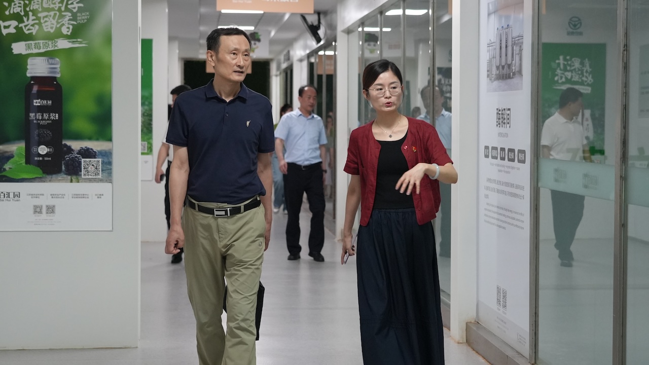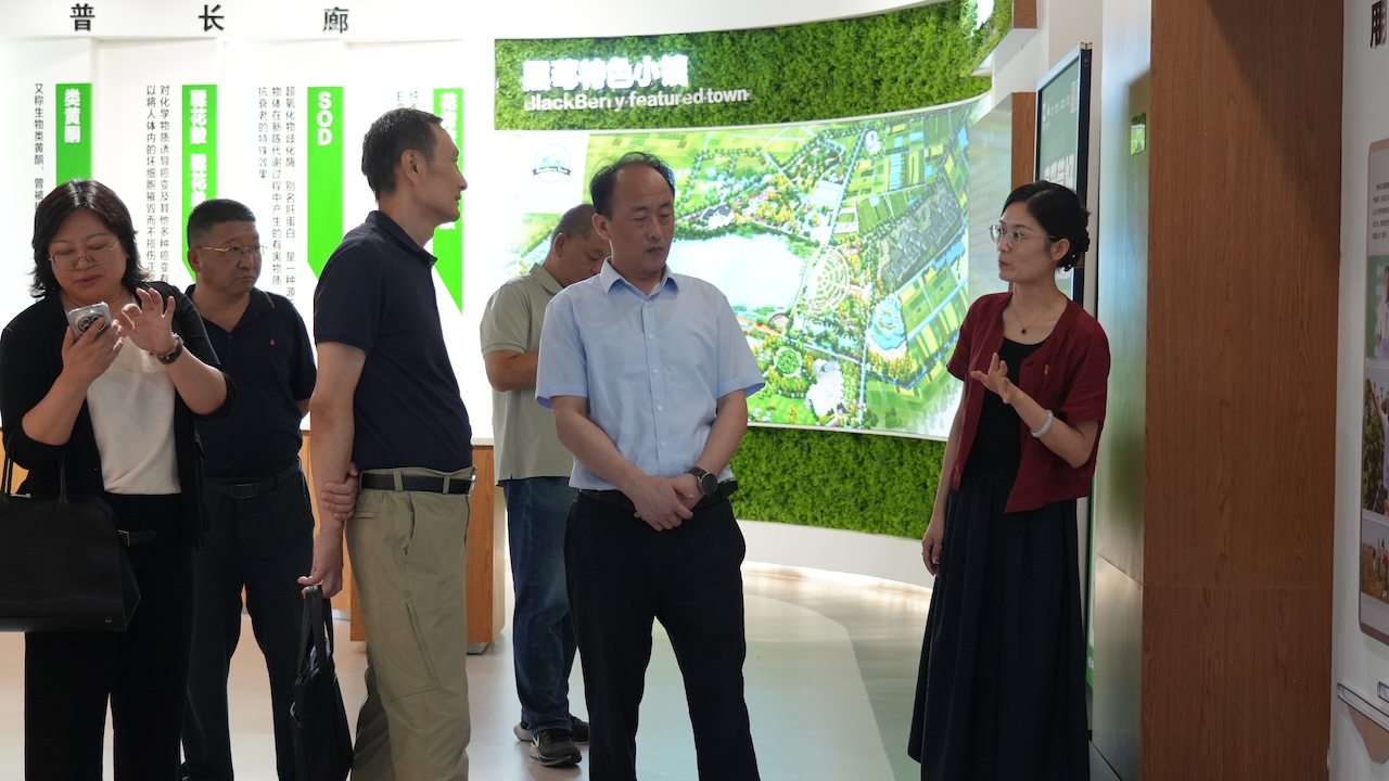一行人实地参观了黑莓展厅、文化廊道及惠新直播实训基地。集团行政总监魏娟详细介绍了百汇园在黑莓种植技术、精深加工产品开发及农旅融合发展等方面的情况,着重介绍了企业在党组织引领下,积极推动一二三产业深度融合发展的生动实践与丰硕成果。